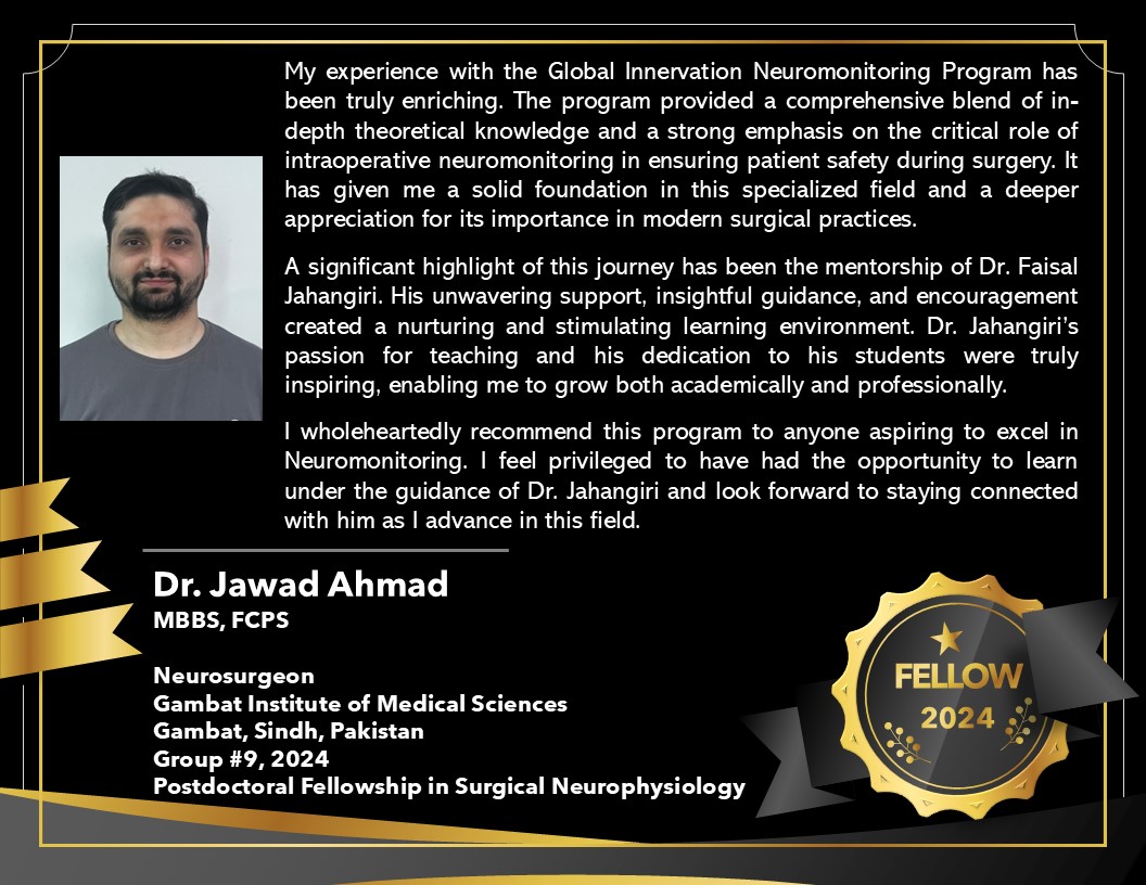 I wholeheartedly recommend this program to anyone aspiring to excel in Neuromonitoring. I feel privileged to have had the opportunity to learn under the guidance of Dr. Jahangiri and look forward to staying connected with him as I advance in this field.