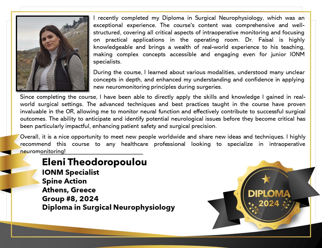 I recently completed my Diploma in Surgical Neurophysiology, which was an exceptional experience. The course's content was comprehensive and well-structured, covering all critical aspects of intraoperative monitoring and focusing on practical applications in the operating room. Dr. Faisal is highly knowledgeable and brings a wealth of real-world experience to his teaching, making complex concepts accessible and engaging even for junior IONM specialists.