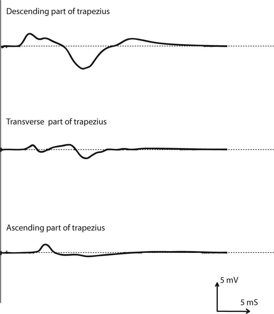 Figure 3. Compound muscle action potentials recorded from the descending, transverse, and ascending parts of the trapezius muscle following electrical stimulation of the spinal accessory nerve in a patient undergoing neck dissection. mV, millivolts; ms, milliseconds [3].