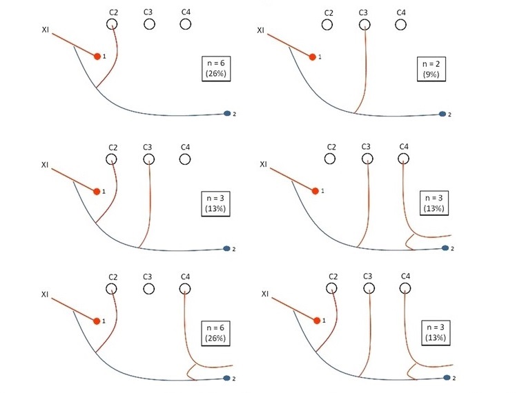 Figure 1. Schematic diagrams of anatomical anastomoses between the SAN branch running to the trapezius and the cervical plexus roots and their frequencies. 1 Indicates the SAN branch for the sternocleidomastoid muscle. 2Indicates the SAN branch running to the trapezius [1].