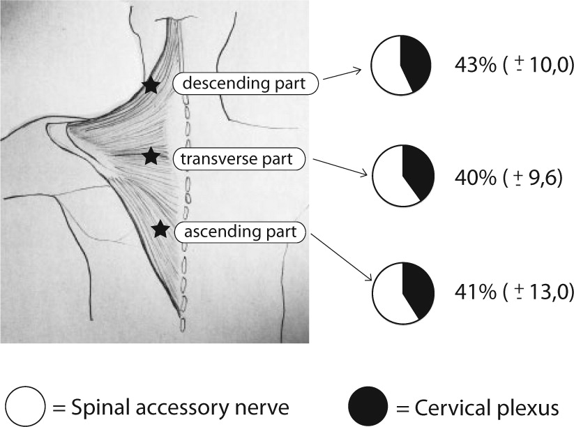 Gavid, M., Mayaud, A., Timochenko, A., Asanau, A., & Prades, J. M. (2016). Topographical and functional anatomy of trapezius muscle innervation by spinal accessory nerve and C2 to C4 nerves of cervical plexus. Surgical and radiologic anatomy : SRA, 38(8), 917–922. https://doi.org/10.1007/s00276-016-1658-1.