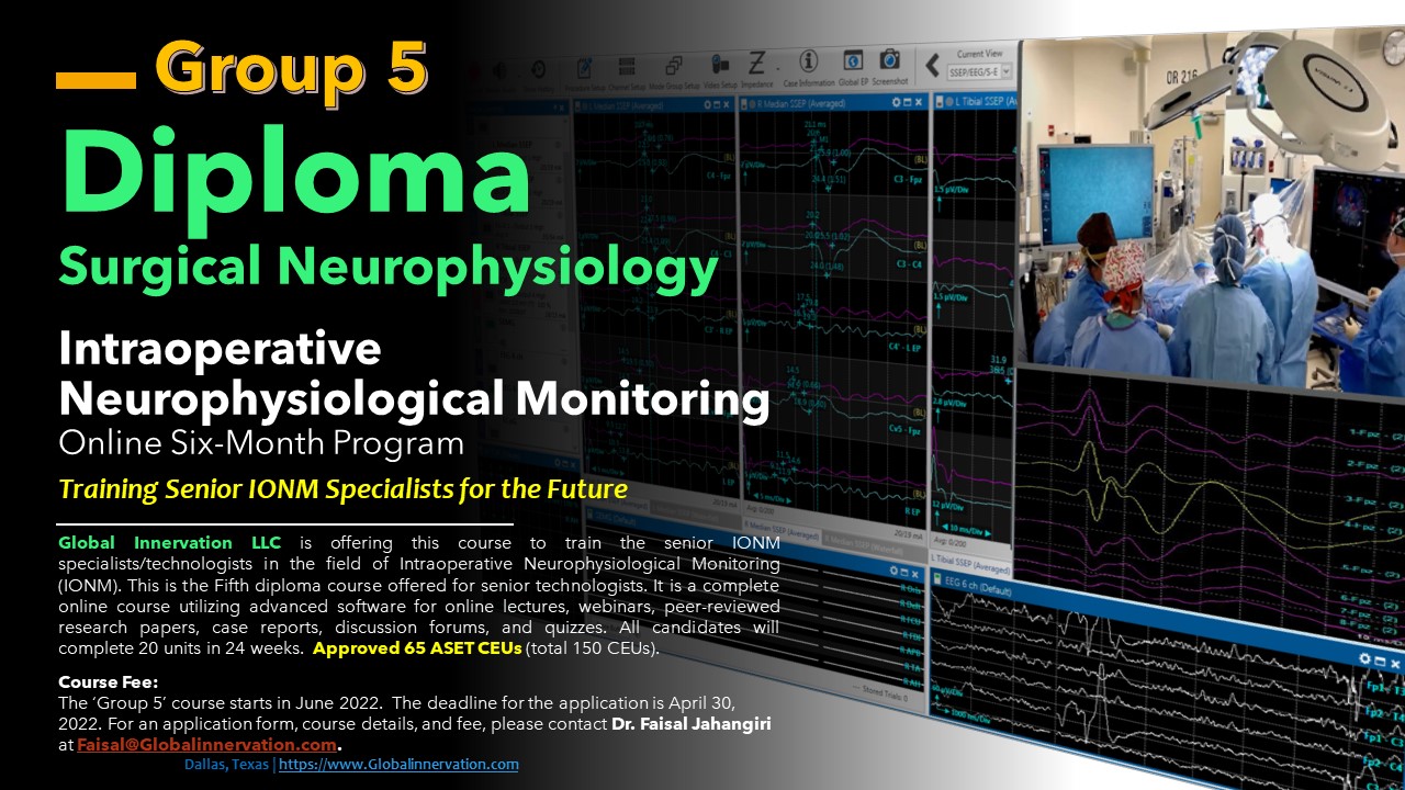 Global Innervation LLC is offering this course to train the senior IONM specialists/technologists in the field of Intraoperative Neurophysiological Monitoring (IONM). This course is the first-ever diploma offered for senior technologists. It is a complete online course utilizing advanced software for online lectures, webinars, peer-reviewed research papers, case reports, discussion forums, and quizzes. All candidates will complete 20 units in 24 weeks. The fifth course started in June 2022.